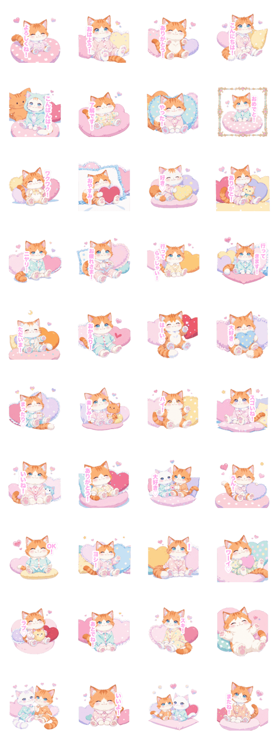 | スタンプ説明 | 可愛い/癒し/日常/挨拶/毎日使える/ねこ/猫/ネコ/子猫/パステル/ハート/もふもふ/ふわふわ/クッション/ドリーミー/スコティッシュフォールド/パジャマ/キュート/星 |