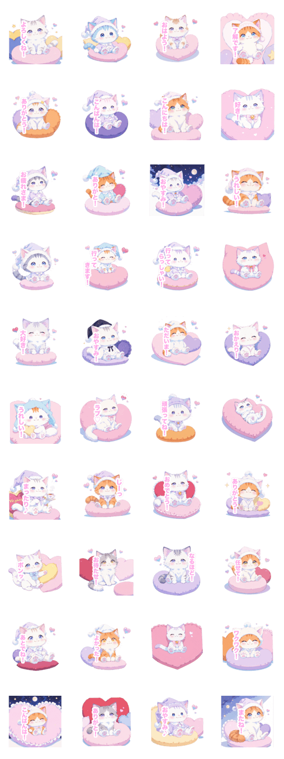 | スタンプ説明 | 可愛い/癒し/日常/挨拶/毎日使える/ねこ/猫/ネコ/子猫/パステル/ハート/もふもふ/ふわふわ/クッション/ドリーミー/スコティッシュフォールド/寝間着帽子/パジャマ/キュート |