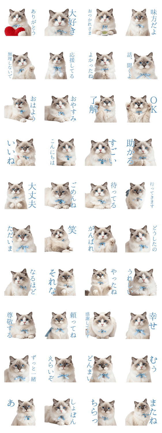 | スタンプ説明 | 聞き上手ラグドール猫が優しく全肯定。毎日使える挨拶や応援、励ましで心に寄り添います。友達や恋人、家族との日常会話に癒しを届けます。 |
