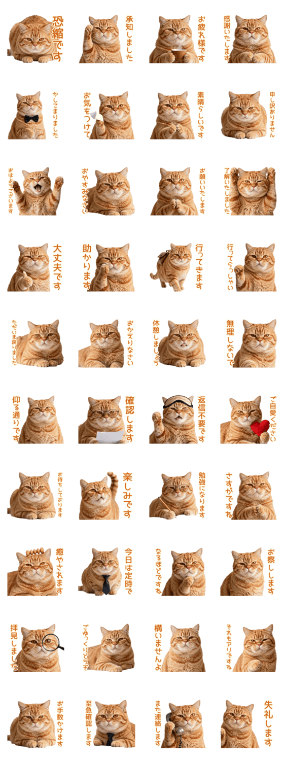 | スタンプ説明 | もちもち茶トラ猫の大人かわいい敬語。職場や日常で使いやすい丁寧な言葉がいっぱい。猫好きに贈る癒しスタンプです。 |