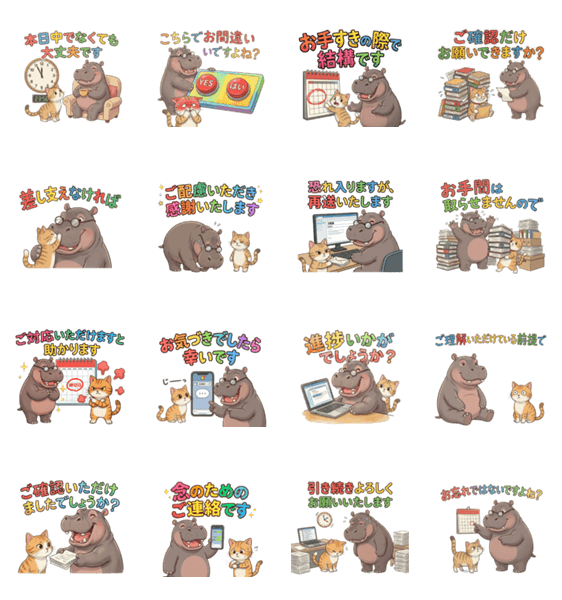 | スタンプ説明 | 丁寧な敬語なのに、絵柄でめちゃくちゃ圧をかけるカバと猫のビジネススタンプです。言いにくい進捗確認や催促、リマインドも、ユーモアと無言の圧力で解決します。 |