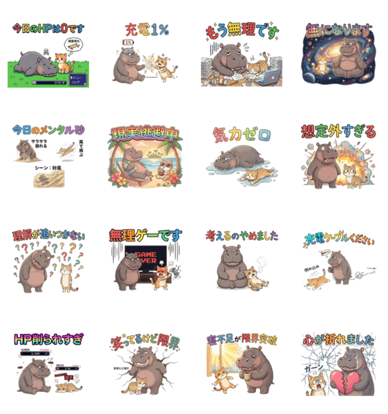 | スタンプ説明 | 毎日限界なあなたへ送る、カバと猫のシュールなスタンプです。メンタルが砂になった時や現実逃避したい時、気まずい空気を笑いに変えてくれます。 |