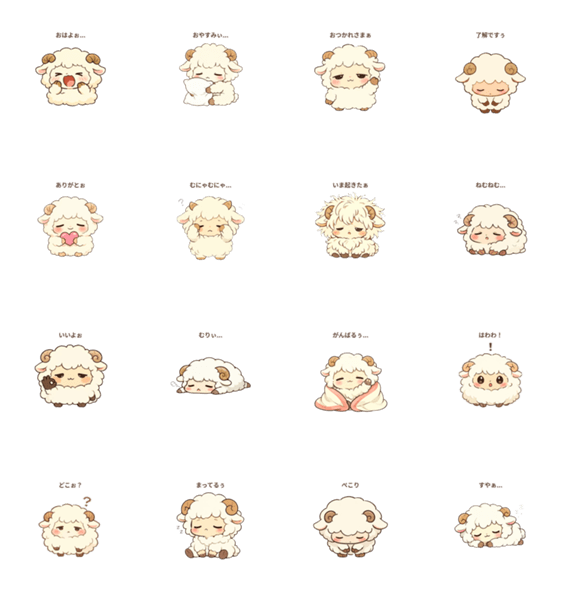 2頭身で眠そうな、もこもこのひつじのスタンプです。ゆるい言葉使いで、日常のトークを優しく彩ります。