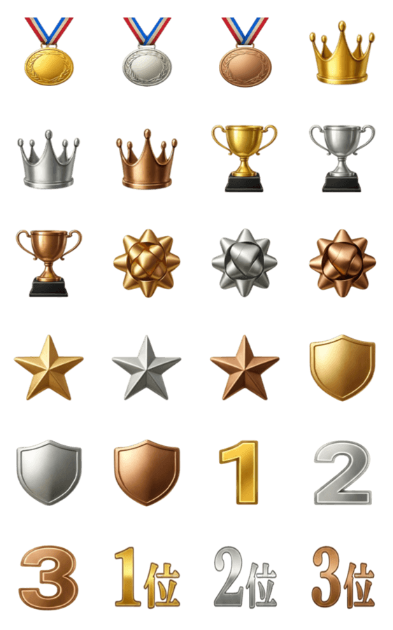 | スタンプ説明 | 1位、2位、3位に使える金色、銀色、銅色のスタンプ。スポーツ応援/数字/合格/入賞/お祝/金メダル/銀メダル/銅メダル/王冠/トロフィー/花/星/盾/ゴールド/シルバー/ブロンズ |