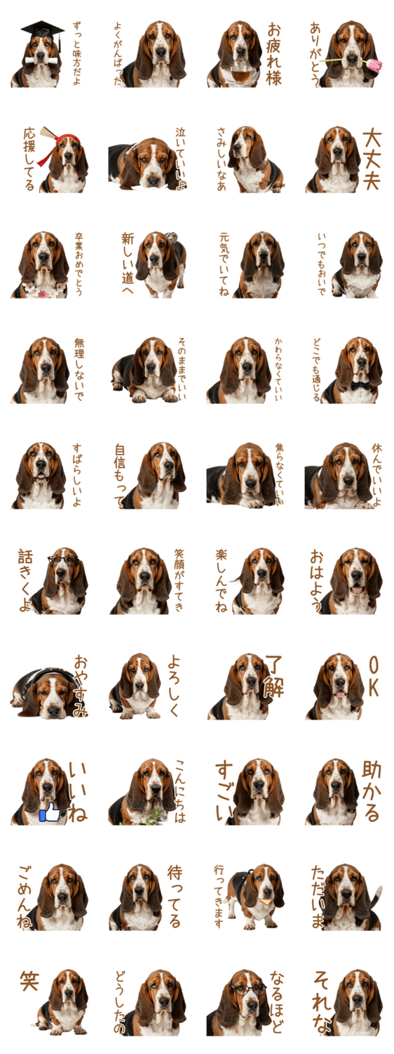 | スタンプ説明 | 聞き上手バセットハウンドが優しく全肯定。卒業や新生活、日々の疲れにそっと寄り添います。不安な心も癒す、優しい日常系です。 |