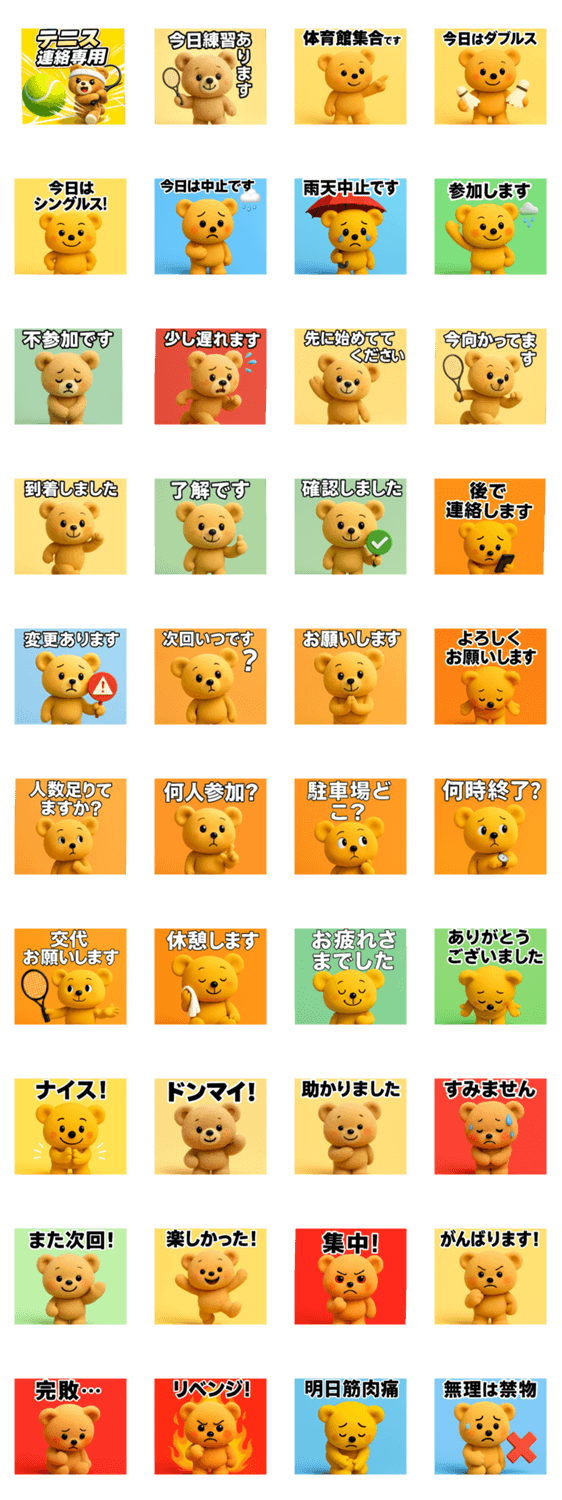 | スタンプ説明 | テニス練習・試合連絡に特化した実用スタンプ。参加・欠席・中止・変更連絡までこれ一つで完結。社会人サークルや部活におすすめです。 |