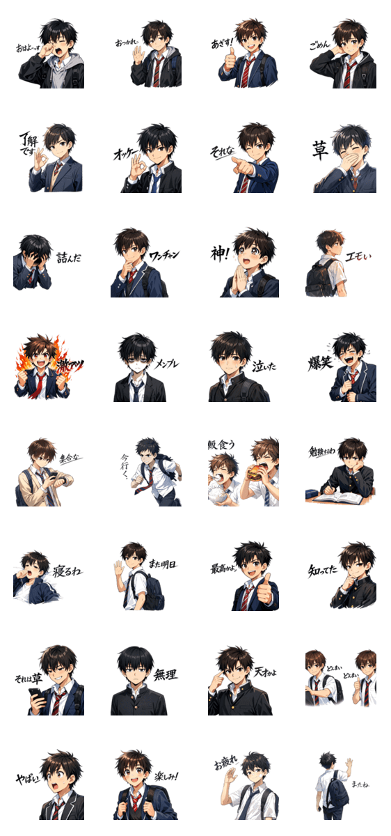 中学生男子が毎日使える、クールでスタイリッシュなアニメ風LINEスタンプ32個セットです。