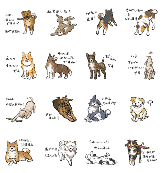 | スタンプ説明 | 雑種犬から柴犬、ハスキーなど、いろんな犬種が登場する敬語スタンプです。 普段遣いしやすいあいさつやリアクションに、少しだけニッチでクセのある一言をプラス! |