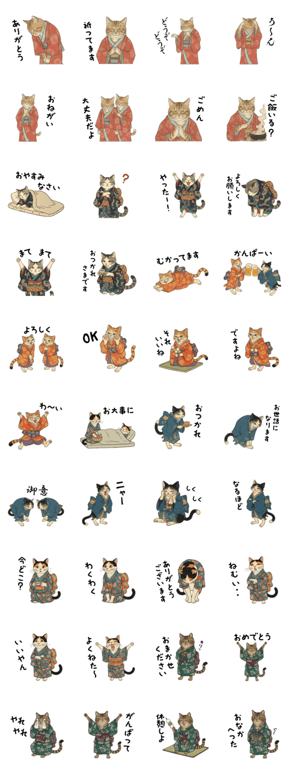 | スタンプ説明 | 浮世絵から飛び出したような可愛くておもしろい猫たちの日常スタンプ。着物を着た猫たちがはんなりと日常を彩ります。和風好き、猫好きな方に。 |