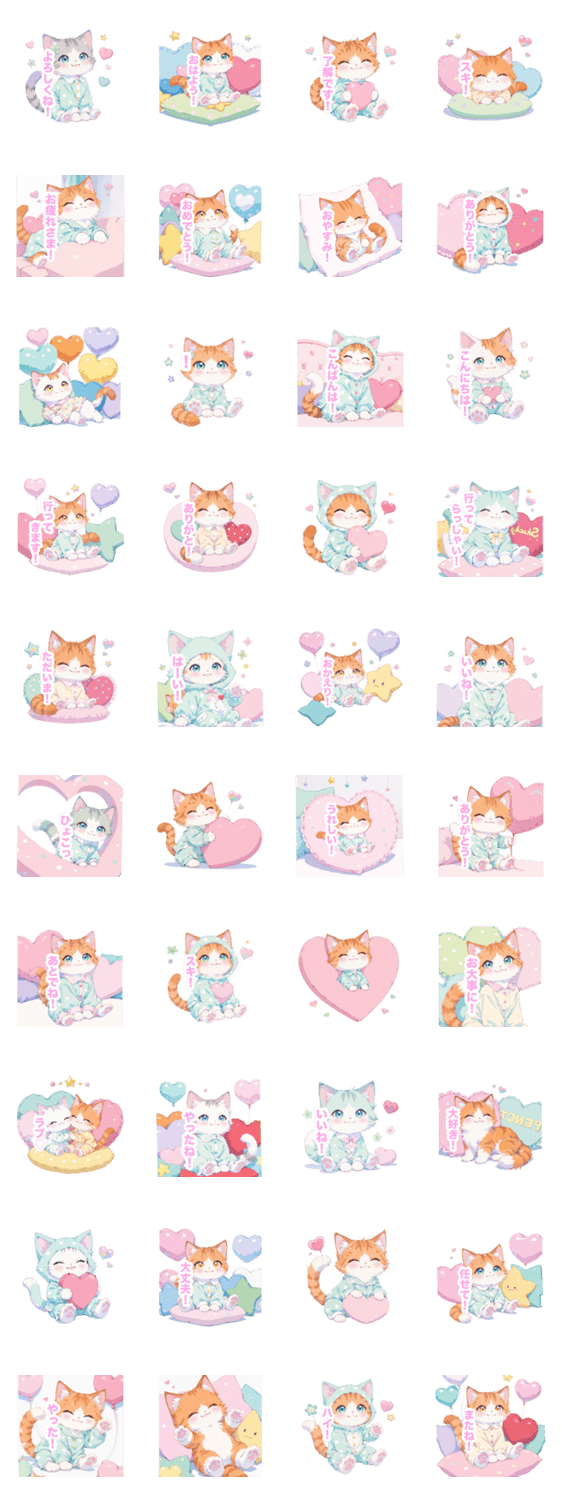 | スタンプ説明 | 可愛い/癒し/日常/挨拶/毎日使える/ねこ/猫/ネコ/子猫/パステル/ハート/もふもふ/ふわふわ/クッション/ドリーミー/スコティッシュフォールド/パジャマ/キュート/星/風船 |