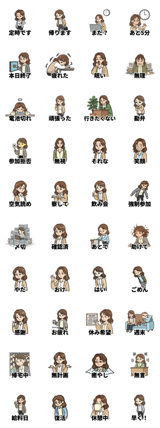 | スタンプ説明 | 大人の仕事の日常を代弁する、ちょっぴり皮肉なスタンプ。上司や同期とのチャットに。 #OL #仕事 #疲れた #本音 #定時 #大人女子 |