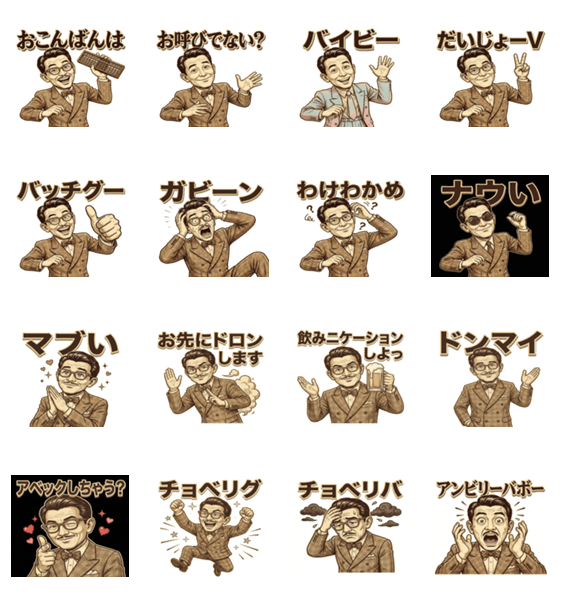 | スタンプ説明 | 昭和の懐かしい死語で返信!「チョベリグ」「バッチグー」「飲みニケーション」などエモくて面白い16種。バブル世代には懐かしく若者には新鮮。世代を超えて楽しめる! |