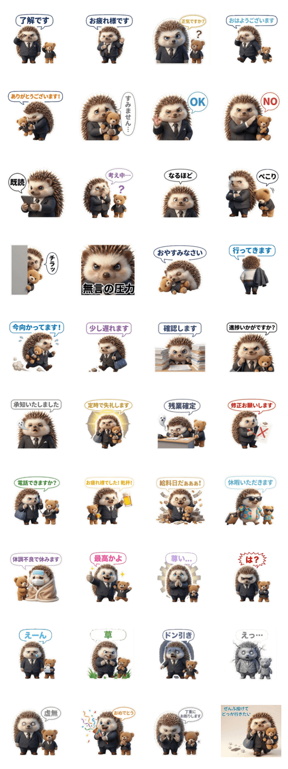 | スタンプ説明 | 青い目のハリネズミとテディベアのコンビ。ビジネスで使える丁寧な敬語から、シュールなネタ、推し活の感情表現まで全方位カバー。かわいいだけじゃない、使えるスタンプ。 |