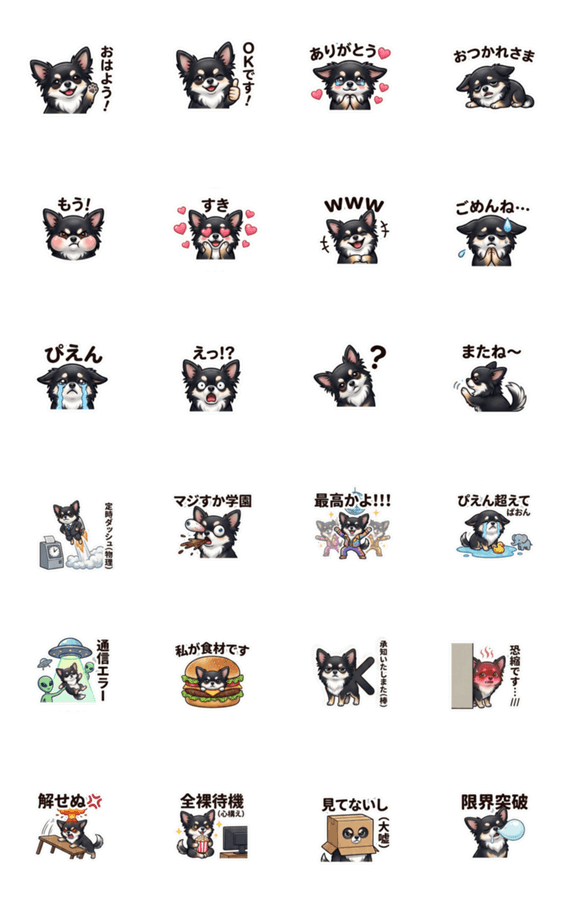 | スタンプ説明 | ブラックタンのチワワのまいにち使えるピカつやスタンプです。可愛い表情で盛り上がります♡ 犬/小型犬/わんちゃん |