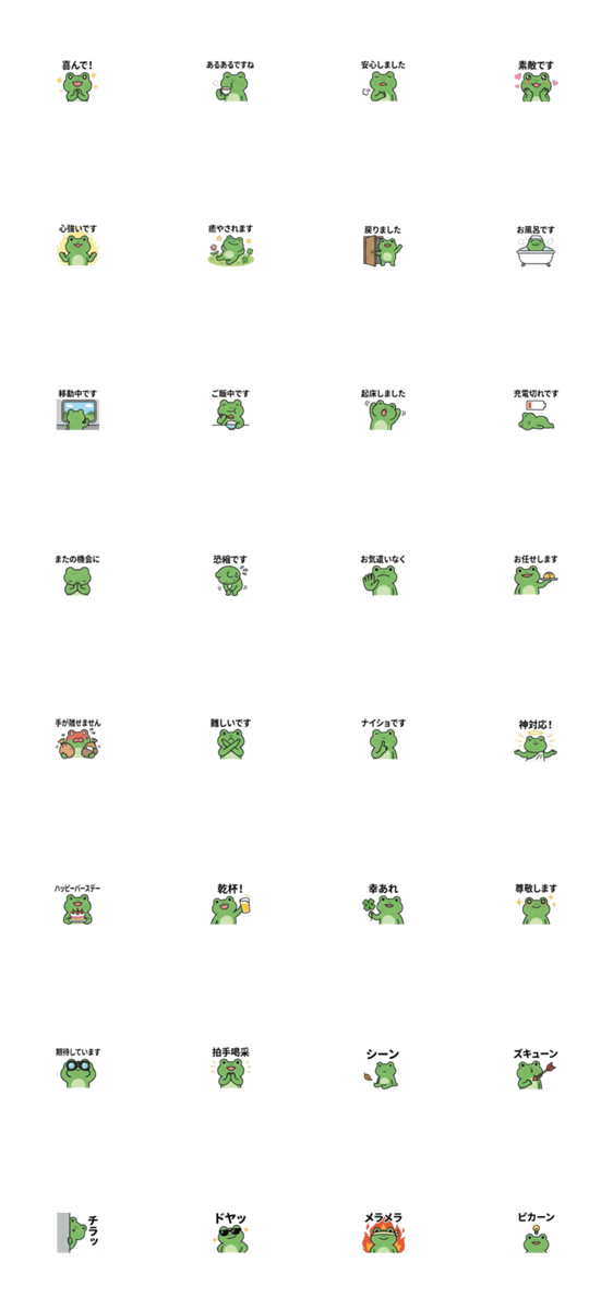 仕事や毎日の連絡に使いやすい、カエルのスタンプ。便利な敬語、挨拶、リアクションを揃えました。