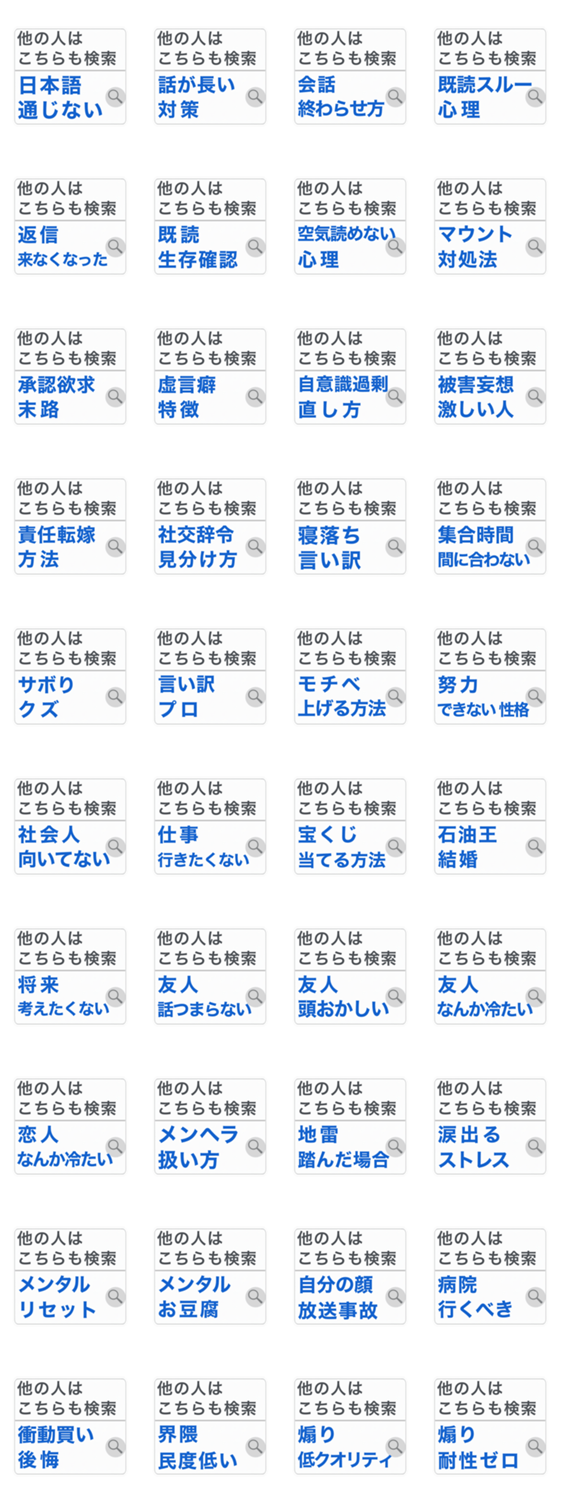 | スタンプ説明 | 他の人はこちらも検索しています。 検索結果画面風。日常会話や煽り、辛辣、自虐、ネタに使えるシュールなスタンプ。 |