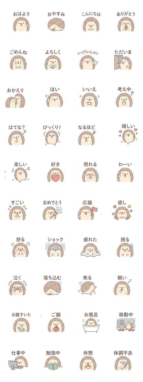 | スタンプ説明 | 丸いハリネズミの日常スタンプ。仕事や家族への連絡に使える丁寧な言葉です。短いトゲとシンプルなデザインが、毎日の挨拶を優しく届けます。 |