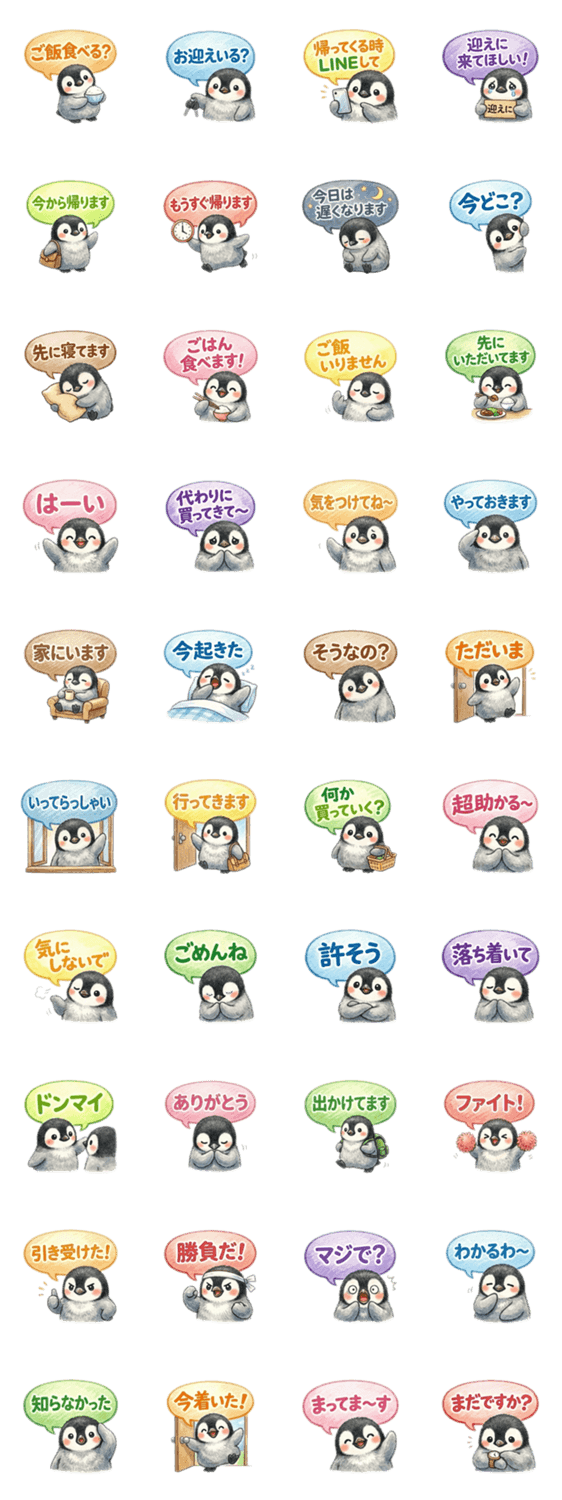 家族や一緒に住んでる人に使いやすい場面を集めたかわいいペンギンのスタンプです☺︎
