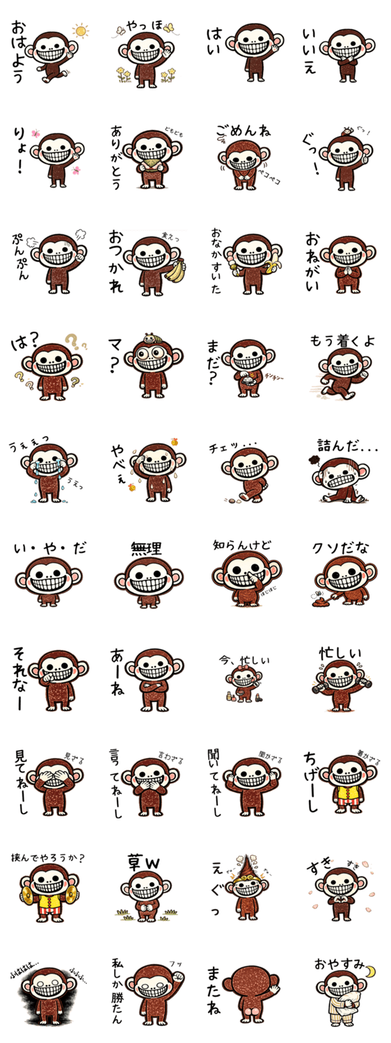 ずっと不気味な笑顔でキモ可愛いお猿のスタンプ。日常のツッコミや本音にどうぞ。
