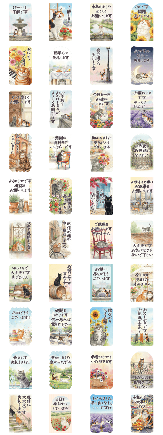 | スタンプ説明 | フランス/花/お花/ポストカード/絵葉書/水彩風/長文/猫/ねこ/ネコ/毎日/連絡/挨拶/敬語/丁寧/日常/家族/友達/お祝い/毎日使える/でか文字/文字大きめ/老眼/シニア/BIG ※このスタンプはトークルームで大きく表示されるBIGスタンプです。 |