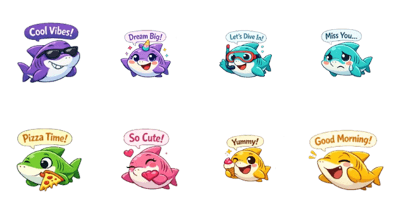 | スタンプ説明 | Spread joy with this adorable, chubby shark! Packed with essential English phrases and a big smile, this colorful shark makes every conversation more fun. |