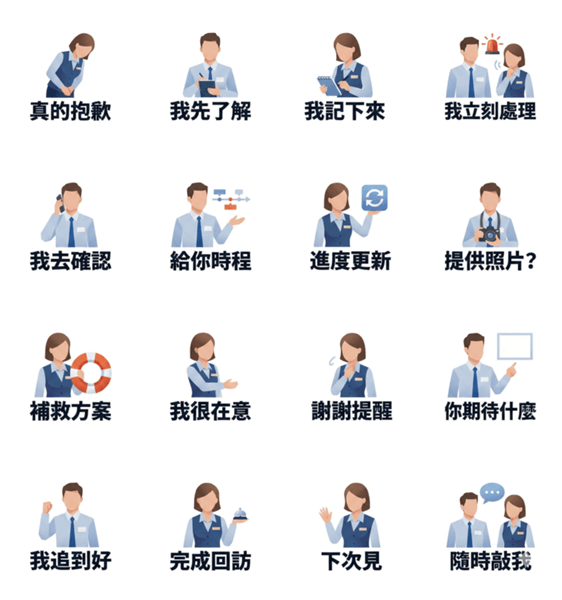 | スタンプ説明 | Handle complaints with empathy. Apologize sincerely, offer solutions, and follow up. Maintain great client relationships even after the trip. |