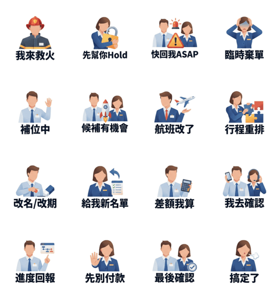 | スタンプ説明 | Handle travel emergencies like a pro. Manage cancellations, schedule changes, and urgent re-bookings while keeping clients calm and updated. |