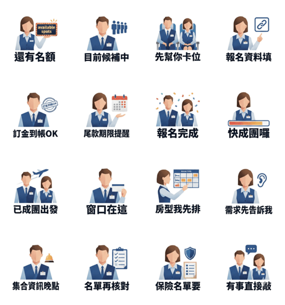 | スタンプ説明 | Manage group tour bookings. Notify clients about availability, waitlists, deposits, and final payments. Announce tour confirmations easily. |