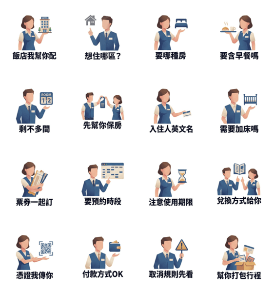 | スタンプ説明 | Manage hotel and ticket bookings easily. Ask about room types, breakfast, and validity. Perfect for confirming reservations and payments. |