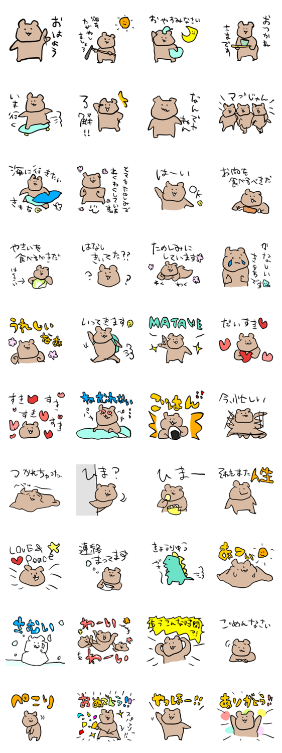 | スタンプ説明 | 利き手じゃない手で描いたくまさんです。 クマ/熊/恐竜/ゆるい/落書き/らくがき/ゆるい絵/イラスト/文字/下手/かわいい/毎日使える/日常 |