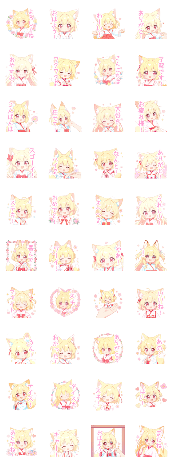 | スタンプ説明 | 金髪/ブロンド/狐/狐耳/ゆるかわ/かわいい/可愛い/挨拶/日常/パステル/会話/女の子/女子/癒し/ゆるい/ふわふわ/甘い/ちびキャラ/ミニキャラ/デフォルメ/花/ハート/好き |