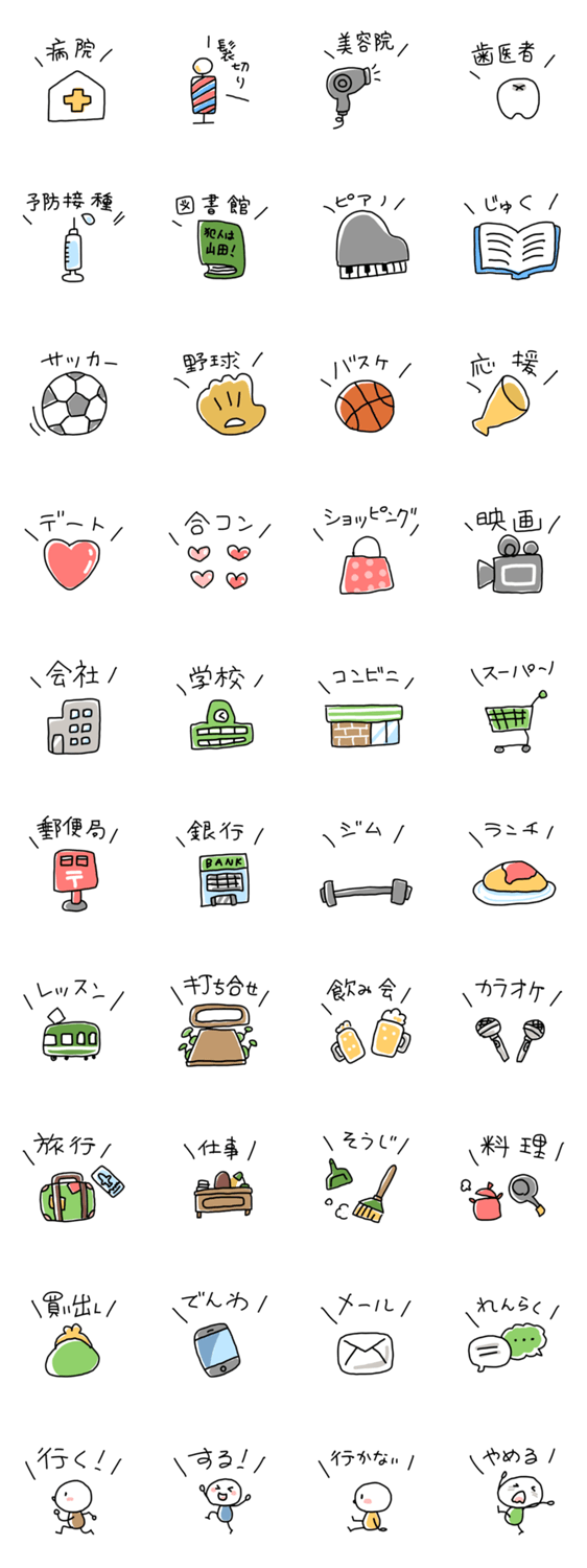 | スタンプ説明 | 病院、会社、学校、習い事、買い物、デートまで。 「行く」「する」をゆるいアイコンでサクッと報告! 伝わるシンプル設計。 予定連絡に便利な実用スタンプです。 |