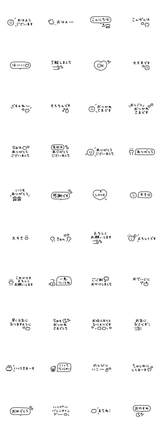 | スタンプ説明 | 返信の最後にあると便利!ゆるい手書きのメッセージスタンプです! あいさつ/線画/うさぎ/くま/スマイル/省スペース |