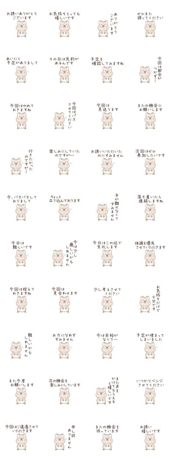 | スタンプ説明 | 丁寧に断りたいときにすぐ使える、クオッカのシンプルで大人かわいい便利なスタンプです。 (敬語/丁寧/毎日/日常/返事/リアクション/気遣い/手描き) |