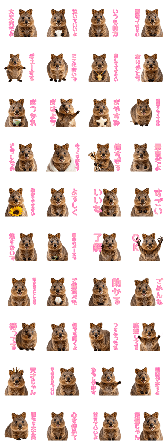 | スタンプ説明 | いつも頑張るあなたへ。世界一幸せな動物「自己肯定感高いクォッカ」が優しい言葉で全肯定!家族や友達をそっと励まし癒やしてくれる、日常で毎日使えるスタンプです。 |