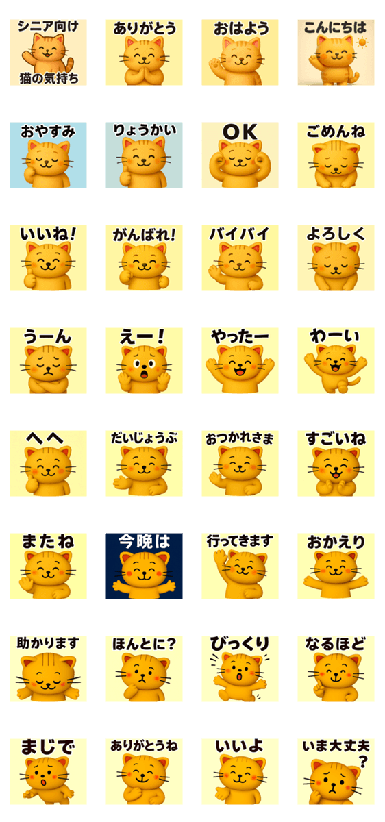 | スタンプ説明 | 見やすくて使いやすい、やさしい猫のスタンプです。 「ありがとう」「おはよう」など、毎日の挨拶や連絡にぴったり。シニアの方にも読みやすい、大きな文字で安心。 |