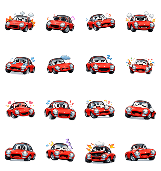 表情豊かな赤い車のスタンプ。嬉しい・怒り・悲しい・楽しいがひと目で伝わるので、返信・リアクション・雑談に大活躍!文字なしでシンプル&万能。