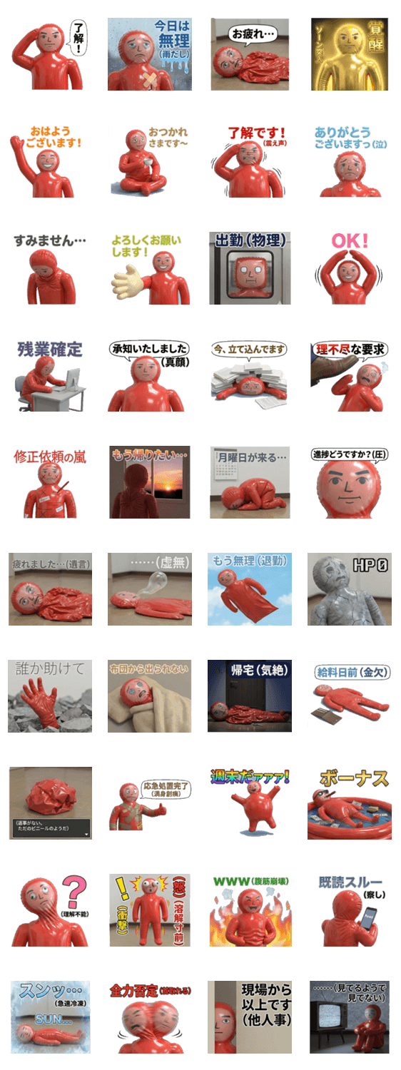 レトロな3Dビニール人形「プシューくん」。空気の抜け具合で仕事の疲れや日々の気力をシュールに表現。残業、虚無、回復など、働く人の哀愁漂うリアクションスタンプです。