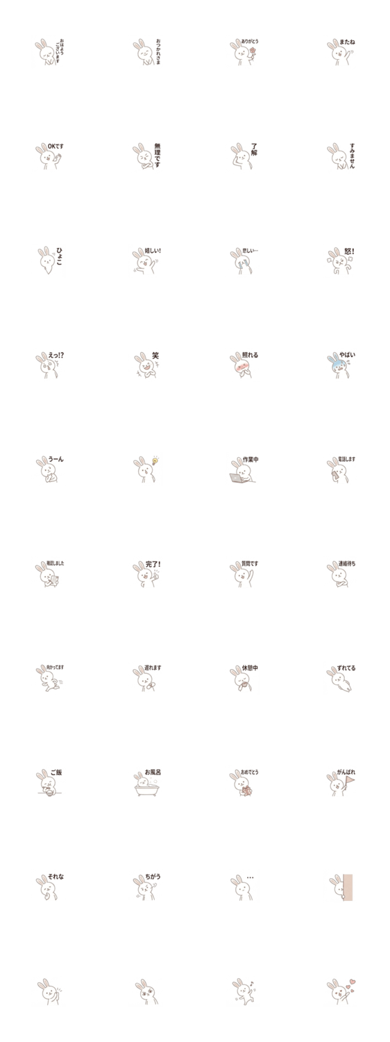 なぜか斜めに傾くウサギ。日常の挨拶や仕事の連絡に便利な敬語と、文字なしでも伝わるリアクション。