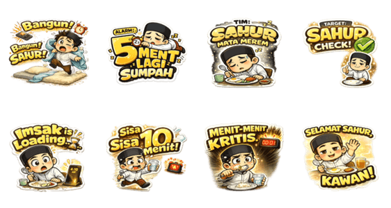 A premium 2D sticker collection capturing the struggle and spirit of Suhoor, from waking up early to the last minutes before Imsak.