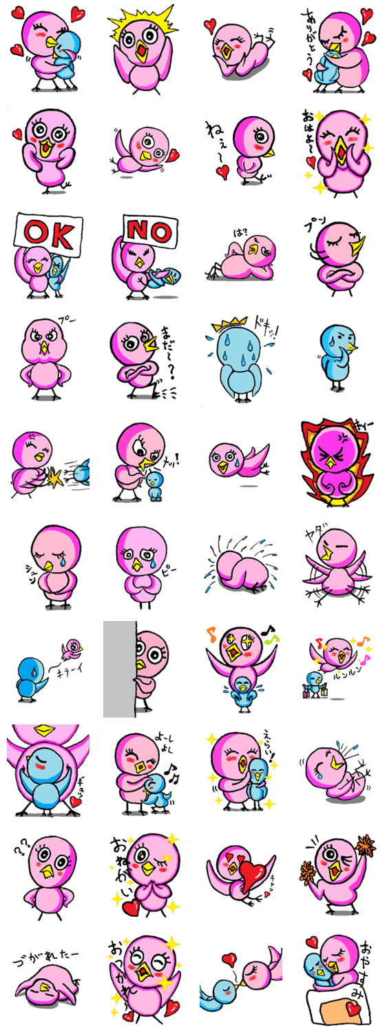 パワフルな大鳥(女)と、か弱い小鳥(男)の日常を描いたスタンプ。カップルで使えるスタンプもいっぱい!上手にアメとムチのスタンプを使い分け、男を手の平で転がそう!