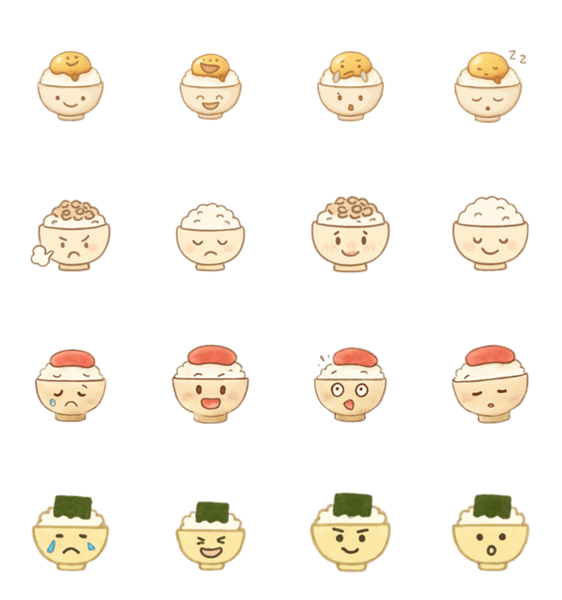 朝の定番ごはん「卵かけ御飯・納豆御飯・明太子・海苔」が、ゆるかわスタンプに!毎日の挨拶、朝の会話、食事報告に大活躍。家族・友達・職場でも使いやすい万能スタンプ