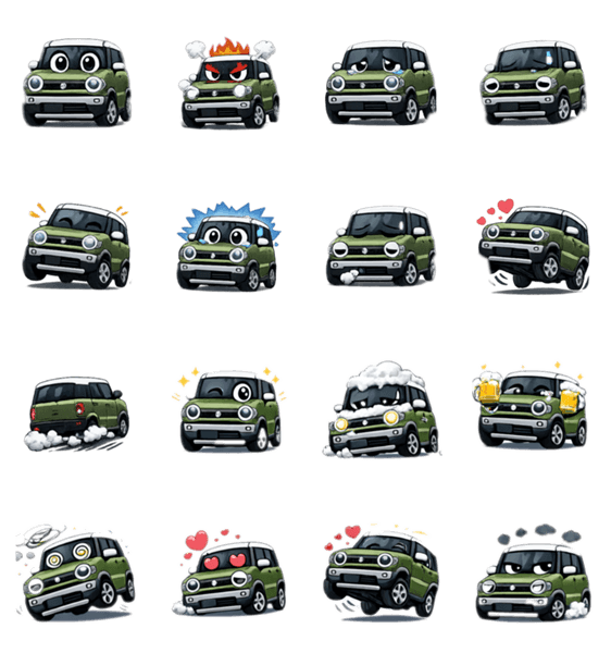 ゆるかわな軽SUVが喜怒哀楽たっぷりで登場!あいさつ・返事・リアクションなど毎日のトークで大活躍。車好きも思わず使いたくなる、実用性バツグンのスタンプです。