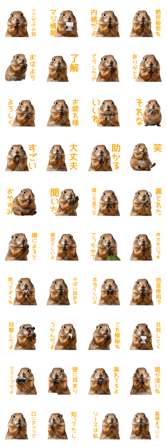 | スタンプ説明 | 町内の噂を全て知る「情報通プレーリードッグ」のシュールなスタンプ。友達同士の秘密の会話やここだけの話など、極秘スクープを共有したい時にゆるく使えます。 |