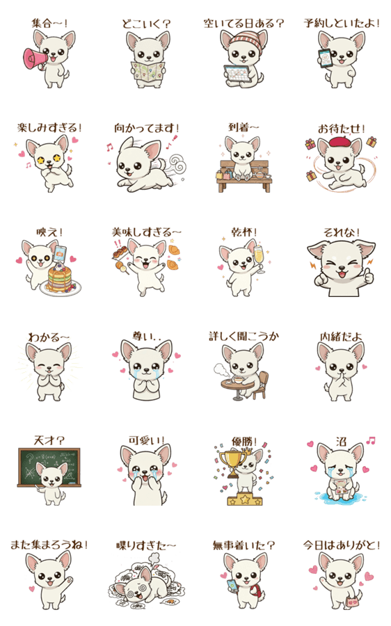 可愛いチワワと一緒に集まりましょう!週末の予定を立てる時にぴったりです。これらのスタンプを使えば計画を立てるのが楽しくなり、みんなのワクワク感を高めてくれます。