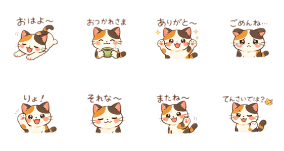 ゆるふわ三毛猫のスタンプです。 日常で使いやすいひらがなフレーズをそろえました。