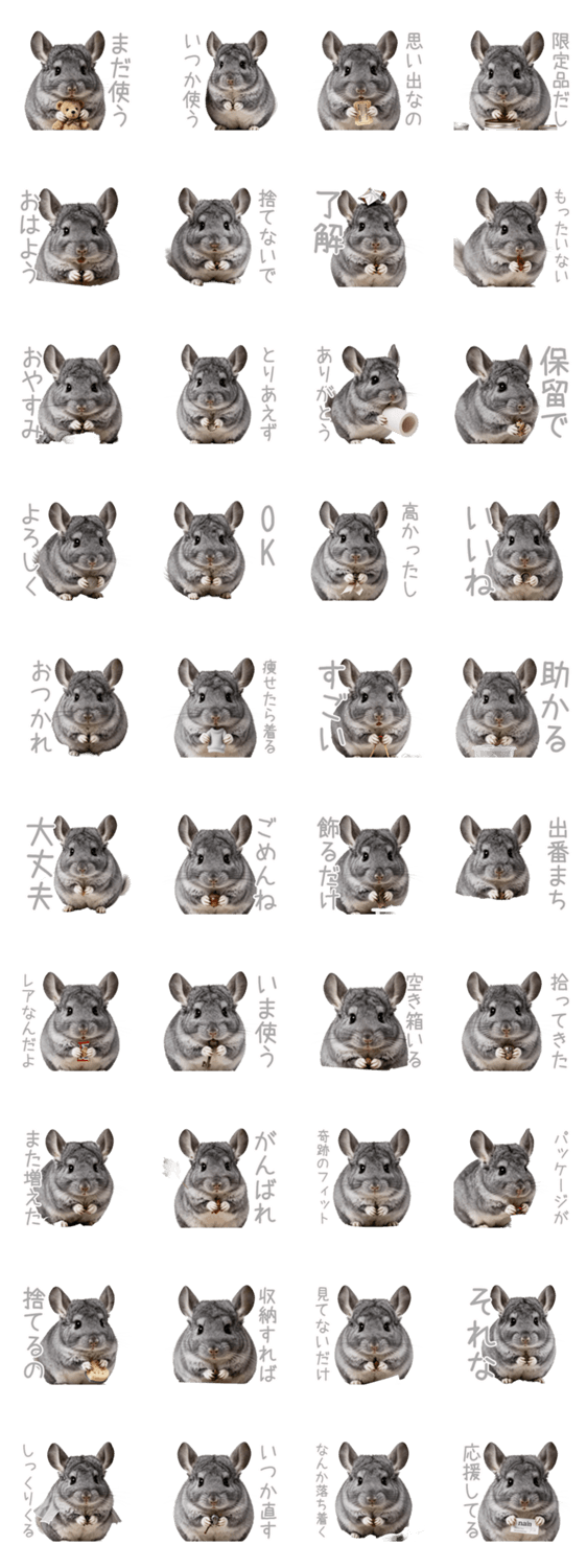 | スタンプ説明 | 「断捨離できないチンチラ」の捨てられない言い訳スタンプ。収集癖のある友達との会話や、笑えるゆるい挨拶に!もったいない精神を応援するシュールなネタ系。 |