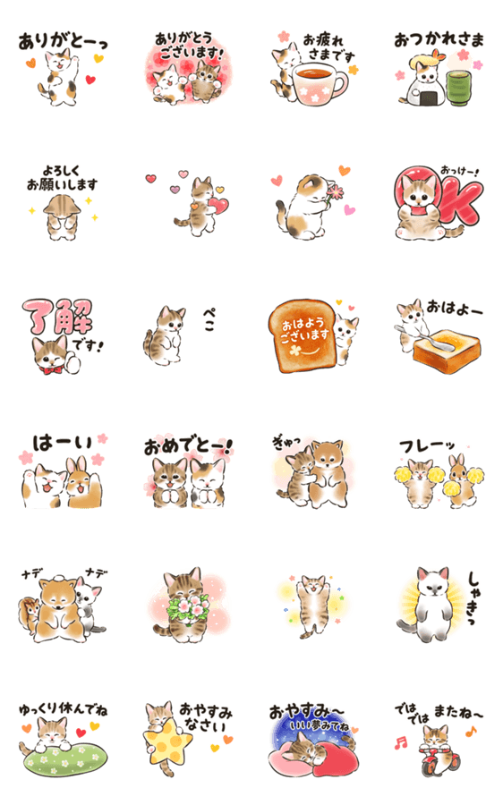 毎日の挨拶などに使える表現が満載♪かわいく動く猫たちのスタンプです(あいさつ/かわいい/敬語/年中/日常/ねこ/春)