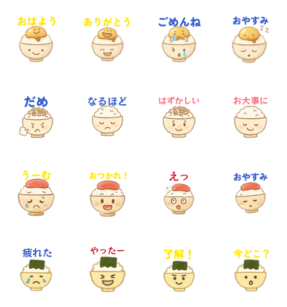 朝の定番ごはん「卵かけ御飯・納豆御飯・明太子・海苔」が、ゆるかわスタンプに!毎日の挨拶、朝の会話、食事報告に大活躍。家族・友達・職場でも使いやすい万能スタンプ