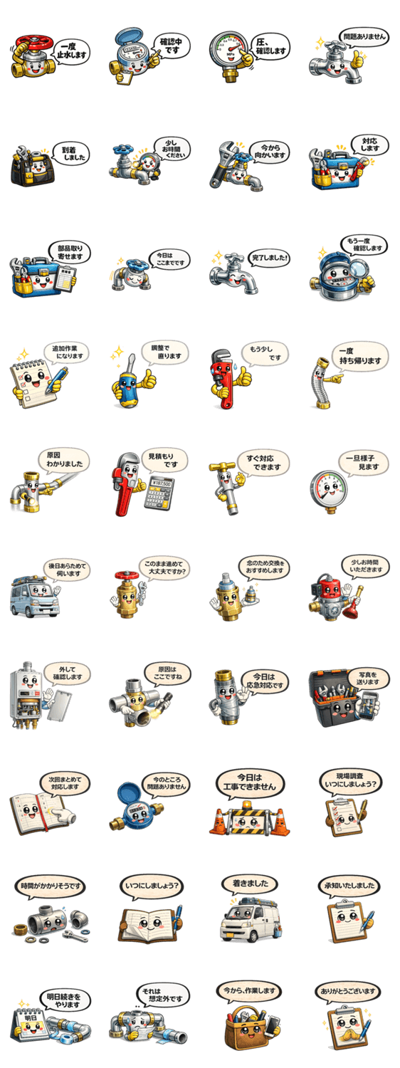 現場で本当に使える、水道屋さんのリアルな一言スタンプ。 職人さんはもちろん、工事関係のやり取りや日常トークにも使いやすい実用系スタンプです。